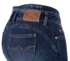 BERING LADY GILDA, Jeans de corte justo especialmente concebidos para mulheres, feitos de denim elástico e Dupont Kevlar®. Equipadas com proteções homologadas e ajustáveis ALPHA nos joelhos. Apresentam um forro fixo de poliéster e algodão muito confortável. As proteções ALPHA nos joelhos são removíveis, e a altura da proteção pode ser ajustada conforme necessário. Há também um compartimento específico para proteções de anca. Com quatro bolsos exteriores e inserções refletoras para maior visibilidade. Certificados CE EN 1621-1:2013, pr EN 17092.