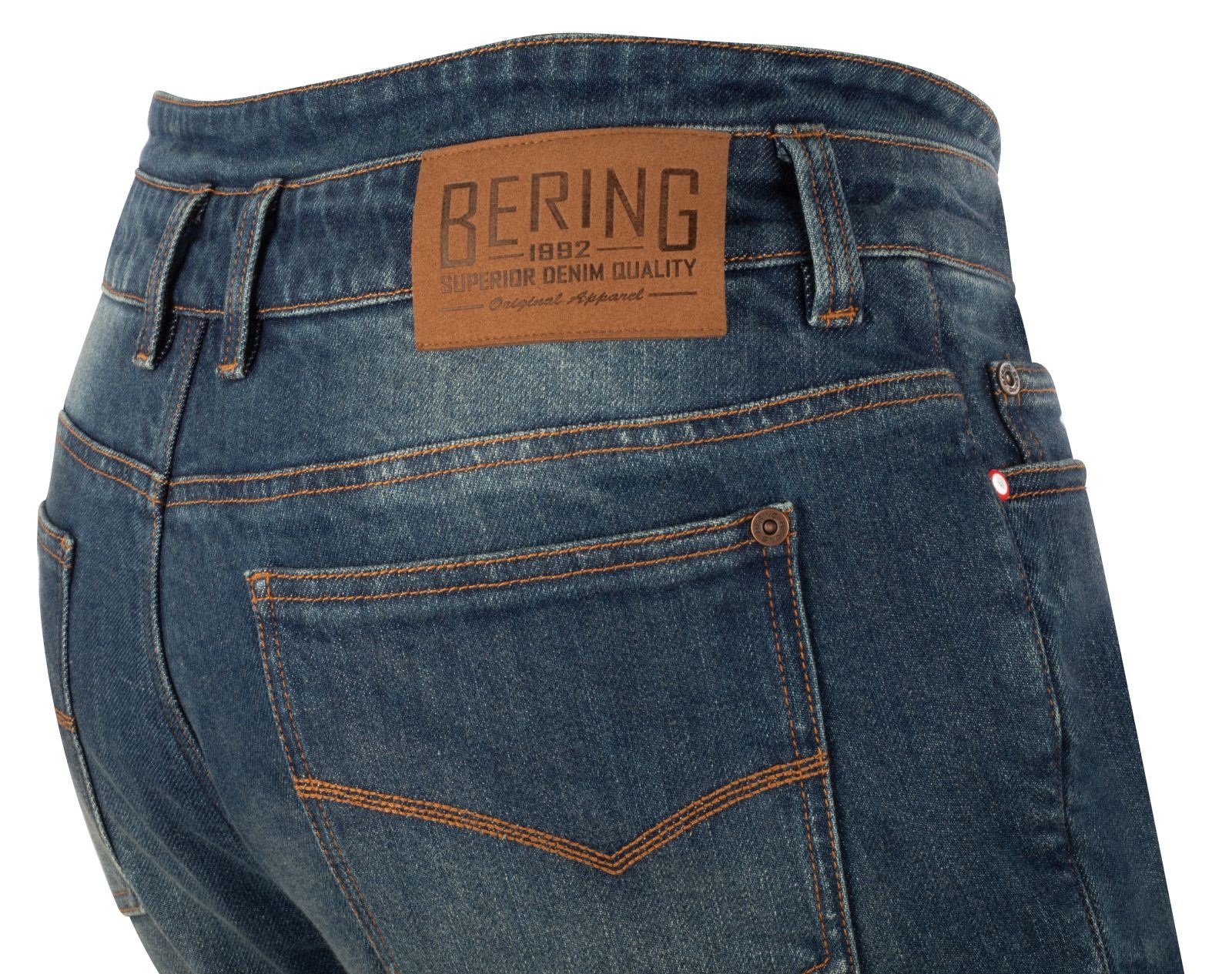 As calças BERING STREAM são jeans de corte reto, feitas de tecido denim elástico e Dupont Kevlar ® para durabilidade e proteção. Vêm com proteções ALPHA ajustáveis nos joelhos, oferecendo segurança durante a condução. Com um forro fixo de poli-algodão para conforto extra, possuem ainda um compartimento para proteções nos quadris e 4 bolsos exteriores para conveniência. As inserções refletoras aumentam a visibilidade, e são certificadas CE EN 1621-1:2013, pr EN 17092.